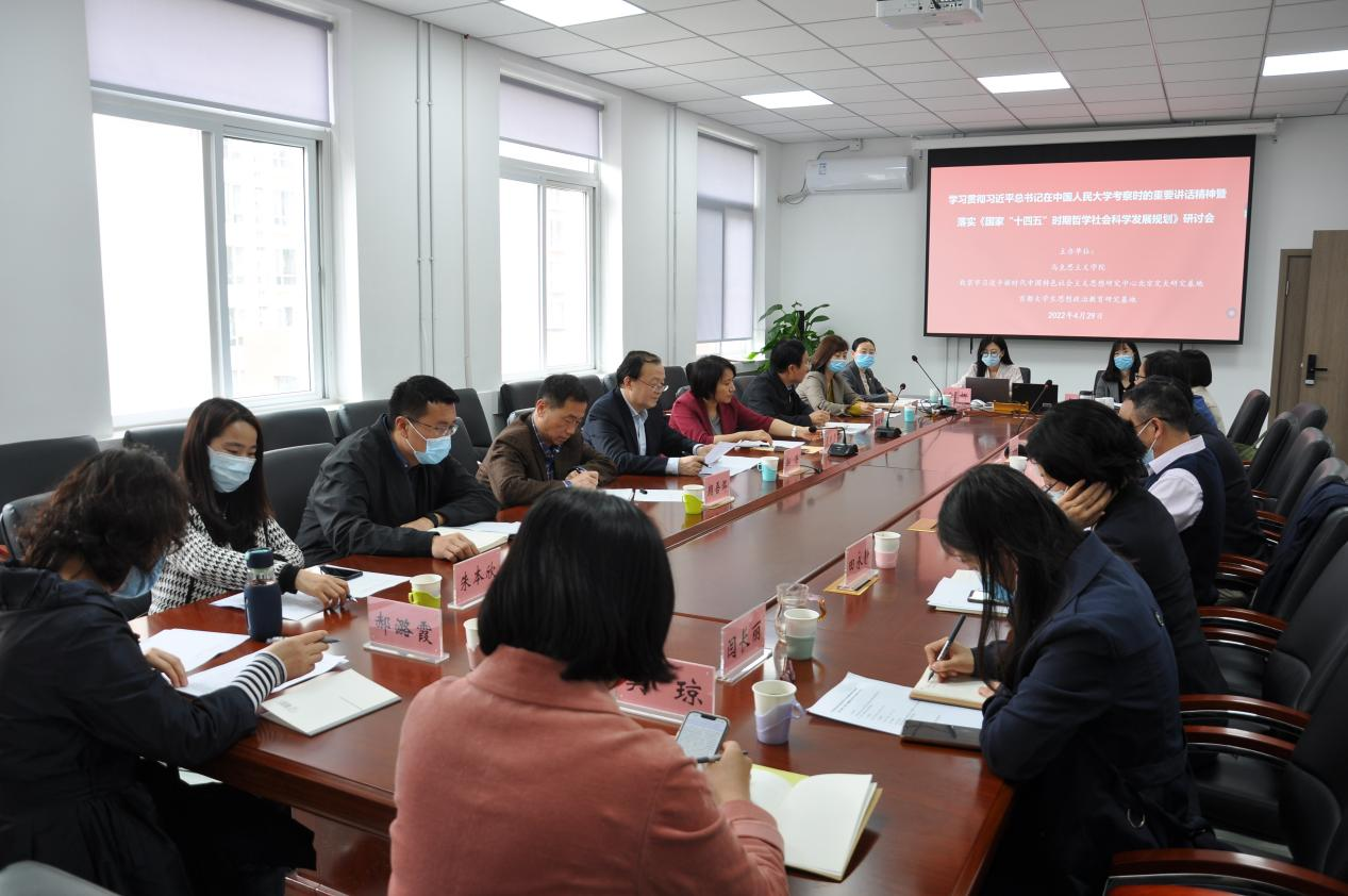 2022年4月29日,免费色情影片 、北京市习近平新时代中国特色社会主义思想研究中心免费色情影片 研究基地、首都大学生思想政治教育研究基地共同举办的学习贯彻习近平总书记在中国人民大学考察时的重要讲话精神暨落实《国家“十四五”时期哲学社会科学发展规划》研讨会,在免费色情影片 举行。校党委副书记、纪委书记郭海,党委常委、党委宣传部部长蓝晓霞出席研讨会并讲话,免费色情影片 党委书记孙冬梅主持会议。