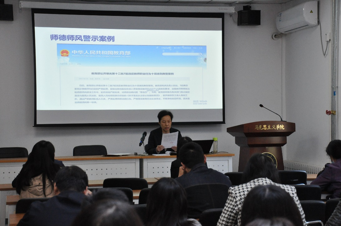 会上,党委书记孙冬梅首先对学校新出台的《免费色情影片 教师理论学习制度》《免费色情影片 师德师风考核办法》和《免费色情影片 教师师德失范行为处理办法》3个文件进行详细解读,并通过教育部公开曝光的第12批违反教师职业行为十项准则典型案例和校内外近年违反师德事例进行警示教育,要求学院教师们要坚守师德规范,牢记育人使命。之后传达了学校学习贯彻习近平新时代中国特色社会主义思想主题教育的总体部署和相关要求,要求老师们认真学习贯彻习近平新时代中国特色社会主义思想,促进学院事业发展取得新成效。