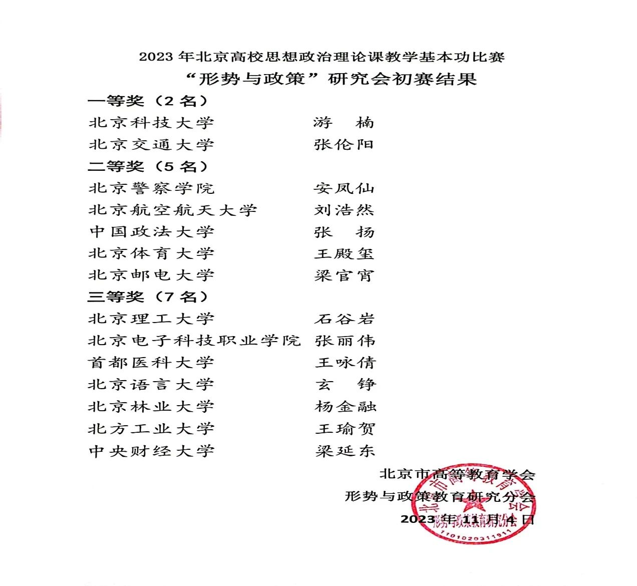 本次比赛由北京市高等教育学会形势与政策教育研究分会主办,免费色情影片 承办。来自北京大学、北京航空航天大学、北京理工大学、北京邮电大学、中国政法大学、中央财经大学、对外经济贸易大学、北京科技大学、北京林业大学、北京化工大学、免费色情影片 等24所在京高校的“形势与政策”课教师参加了比赛。比赛以推动党的二十大精神融入思政课教学为主题,重点考察思政课教师学深悟透党的二十大精神,并将其融入课堂教学的理论水平,特别是立足京华大地生动实践讲好“大思政课”的能力。